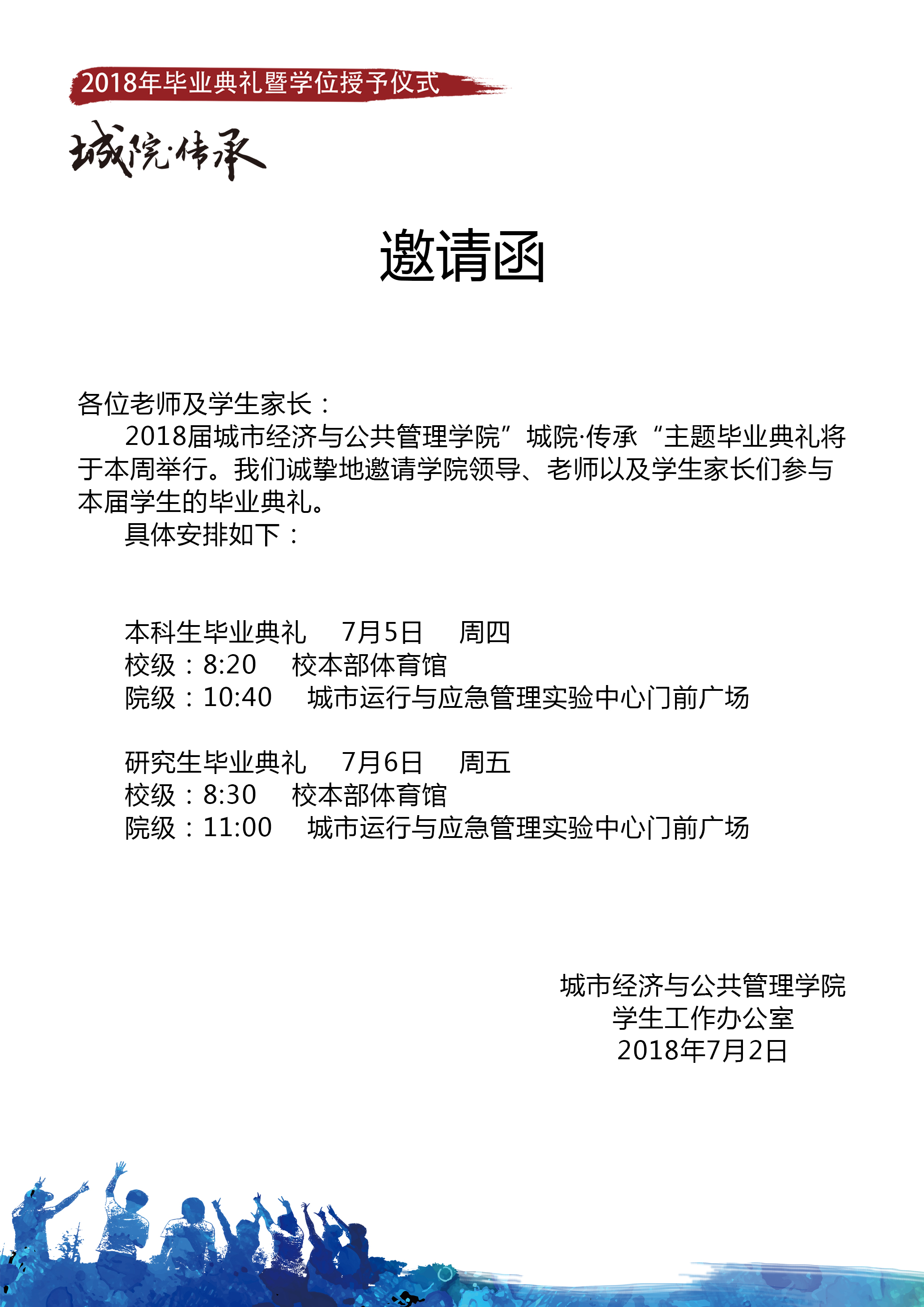 2018届城市经济与公共管理学院“城院·传承”主题毕业典礼将于本周举行。我们诚挚地邀请学院领导、老师以及学生家长们参与本届学生的毕业典礼。