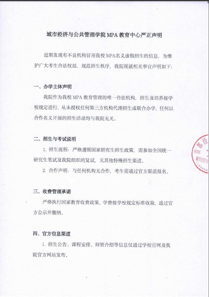 近期发现有不良机构冒用我校MPA名义虚假招生的信息,为维护广大考生合法权益,规范招生秩序,我院现就相关事宜声明如下: