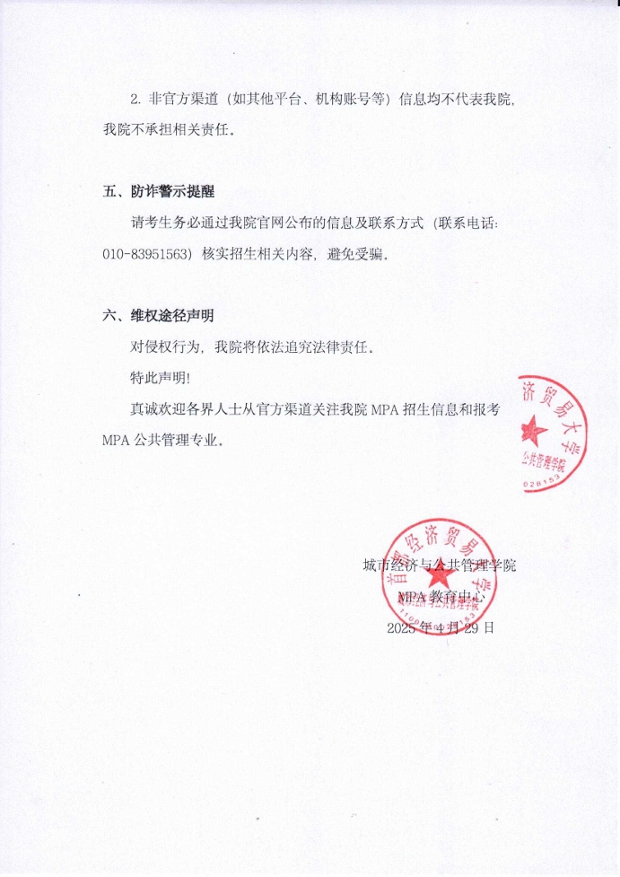 我院作为我校MPA教育管理的唯一合法机构,招生及培养按学校规定进行,从未授权任何第三方机构代理招生或联合办学,任何以合作名义开展的招生活动均与我院无关。
