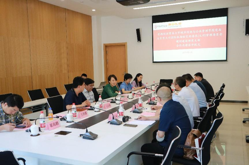 6月27日,城市经济与公共管理学院与北京大兴国际机场临空经济区(大兴)管理委员会规划建设部党支部合作共建签约仪式在首都经济贸易大学博远楼第一会议室举行。临空经济区管理委员会规划建设部,党支部书记、部长吴士成,副部长蔡凌宇、管仲,支部副书记郝朝东,副部长(挂职)李青淼,支部组织委员花超;城市经济与公共管理学院党委书记林卫,党委副书记韩静,副院长刘智勇,院长助理兼土地资源管理系主任徐虹,及各系党支部书记出席仪式和有关活动。仪式由学院党委副书记韩静主持。