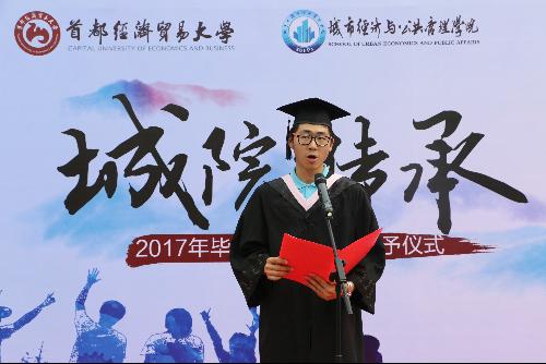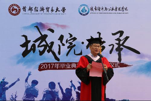 2017年6月29日上午,在校级毕业典礼结束后,城市经济与公共管理学院在城市运行与应急管理实验中心门前广场隆重举行2017届“城院·传承”本科生毕业典礼暨学士学位授予仪式。学院党委书记王德起、副院长张杰、副院长彭文英、党委副书记杨曦与全体本科毕业生共同出席典礼。典礼由杨曦主持。