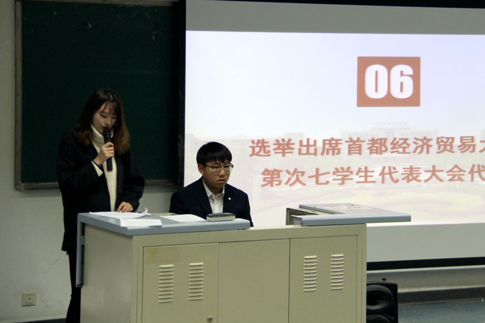 主持人介绍了学院推荐出席首都经济贸易大学第七次学生代表大会代表候选人预备人选的情况。主持人宣读完11位候选人的名单及其详细情况后,由总监票人朱滢主持了后续选举过程。