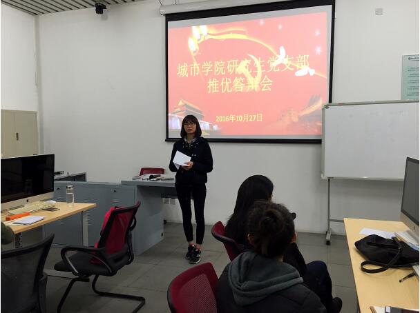 2016年10月27日晚,城市经济与公共管理学院研究生党支部在城市应急实验室114室进行了城市学院研究生党支部入党积极分子推优答辩会。会议的主要内容是讨论并决议5位入党积极分子推优问题。研究生党支部全体党员、入党积极分子以及8名群众参加本次会议。会议由研究生党支部副书记武帆主持。
