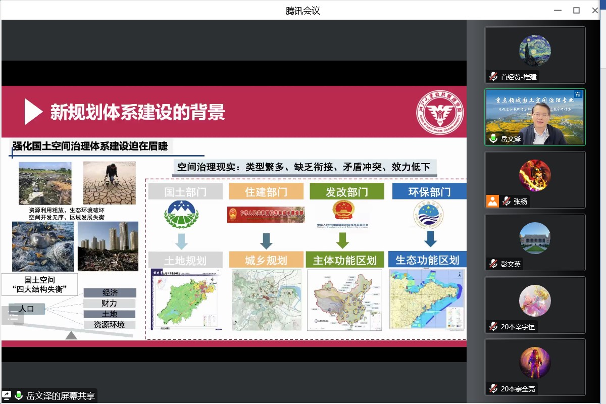 讲座中,岳文泽教授首先从新时代生态文明建设的高度阐述了新规划体系建设的背景、国土空间规划的基本内涵、“三区三线”的背景、目标与定位以及对“三区”与“三线”关系的新思考。