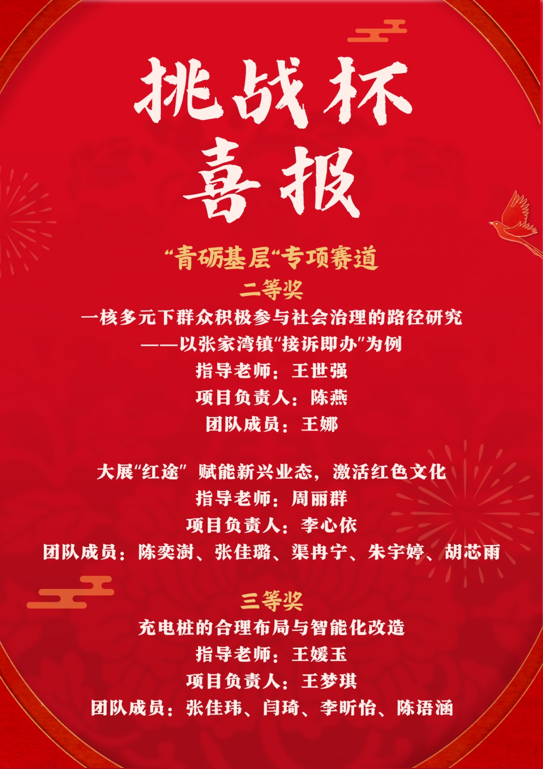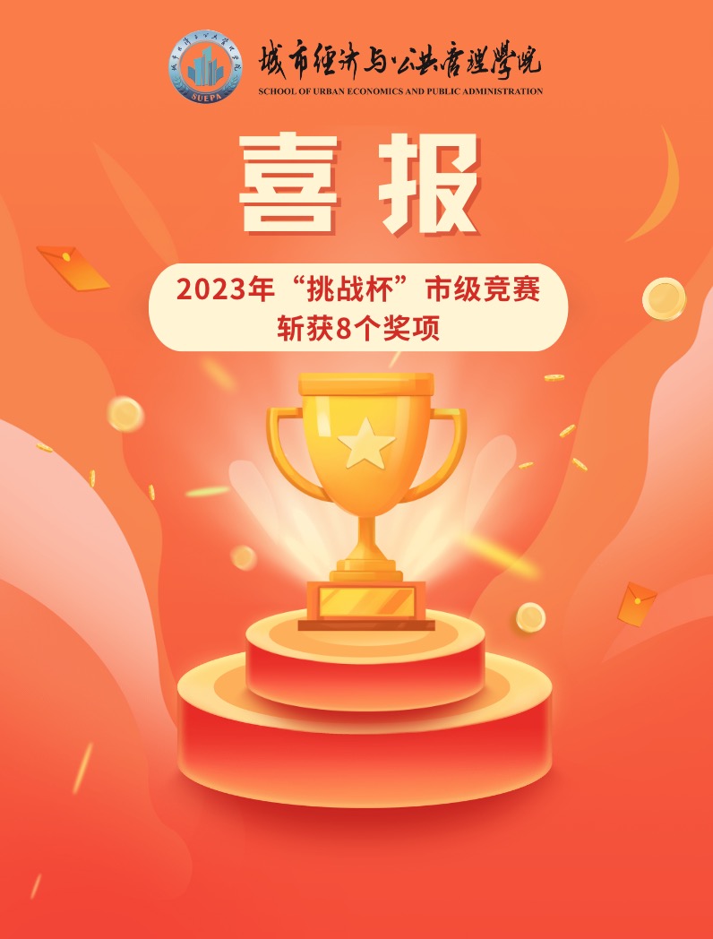 近日,“青创北京”2023年“挑战杯”首都大学生课外学术科技作品竞赛评审环节顺利结束,城市经济与公共管理学院学生再次取得喜人成绩,共计8个项目斩获不同等级奖项。其中,主赛道二等奖1个;“青振京郊”专项赛道一等奖1个、二等奖1个、三等奖1个;“青砺基层”专项赛道二等奖2个、三等奖1个;“青聚奇思”专项赛道三等奖1个。