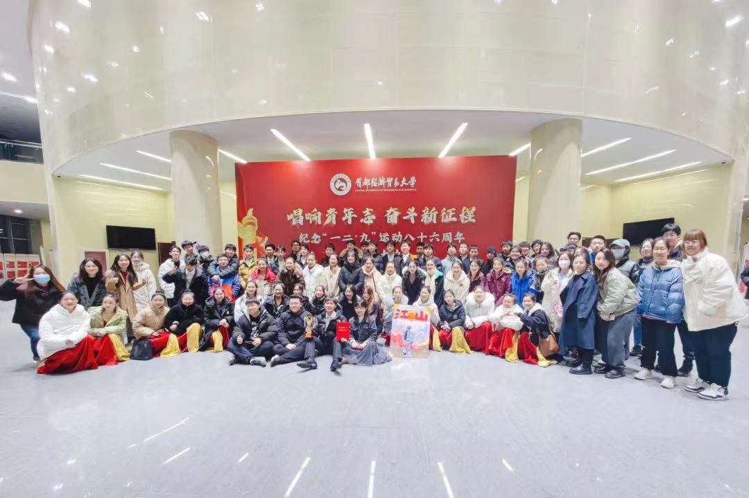 2021 年12月9日下午,首都经济贸易大学在博远楼琢玉讲堂隆重举办了以“唱响青年志 奋斗新征程”为主题的纪念“一二·九”运动八十六周年歌咏大会。城市经济与公共管理学院合唱团在第三篇章“薪火相传·强国有我”中第一个登场,以一曲柔美壮丽的清唱《江山》荣获优胜奖。