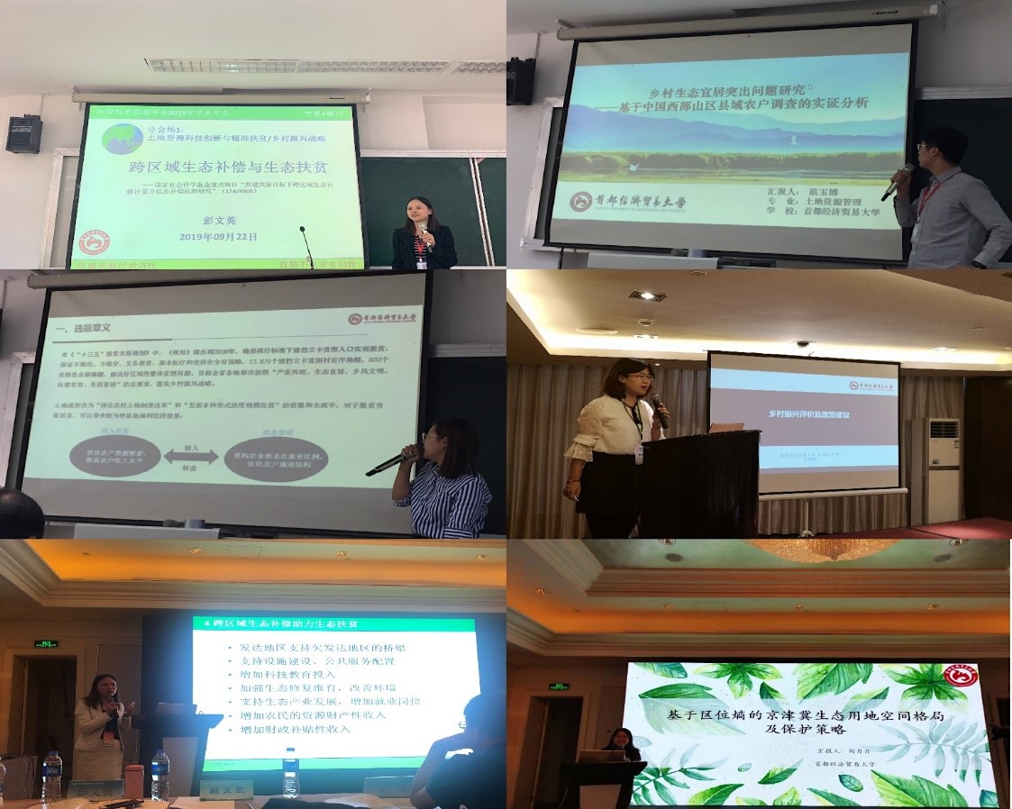 副院长彭文英教授,带领2017级博士研究生王瑞娟、2019级博士研究生刘丹丹、2018级硕士研究生范玉博和李迎晨分别参加了中国自然资源学会2019年学术年会、2019中国区域科学协会年会暨“生态文明建设与区域高质量发展”主题研讨会和中国土地学会2019年学术年会。在各学术会议上,师生共同聆听并学习交流了各大专家学者的前沿科学思想和先进方法,分别在不同会议上做了学术报告,与各同仁和青年学子们进行了多维度的交流与探讨。