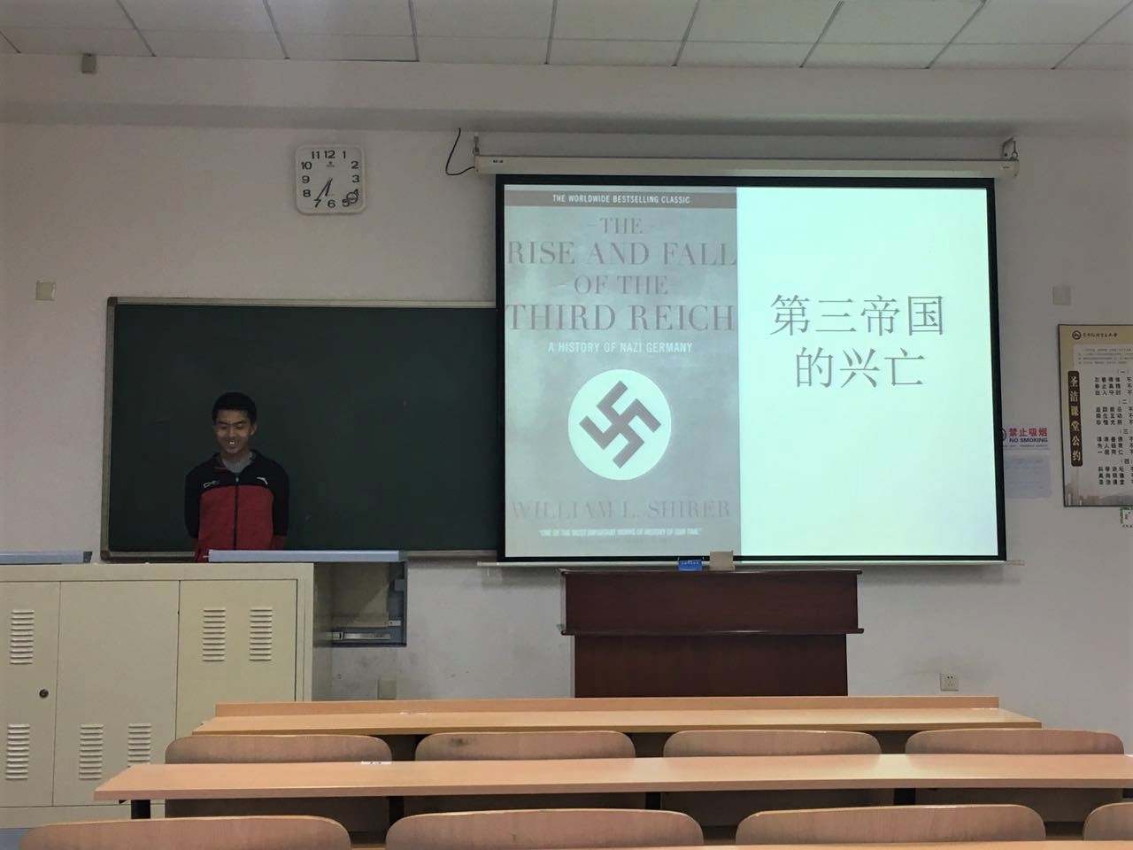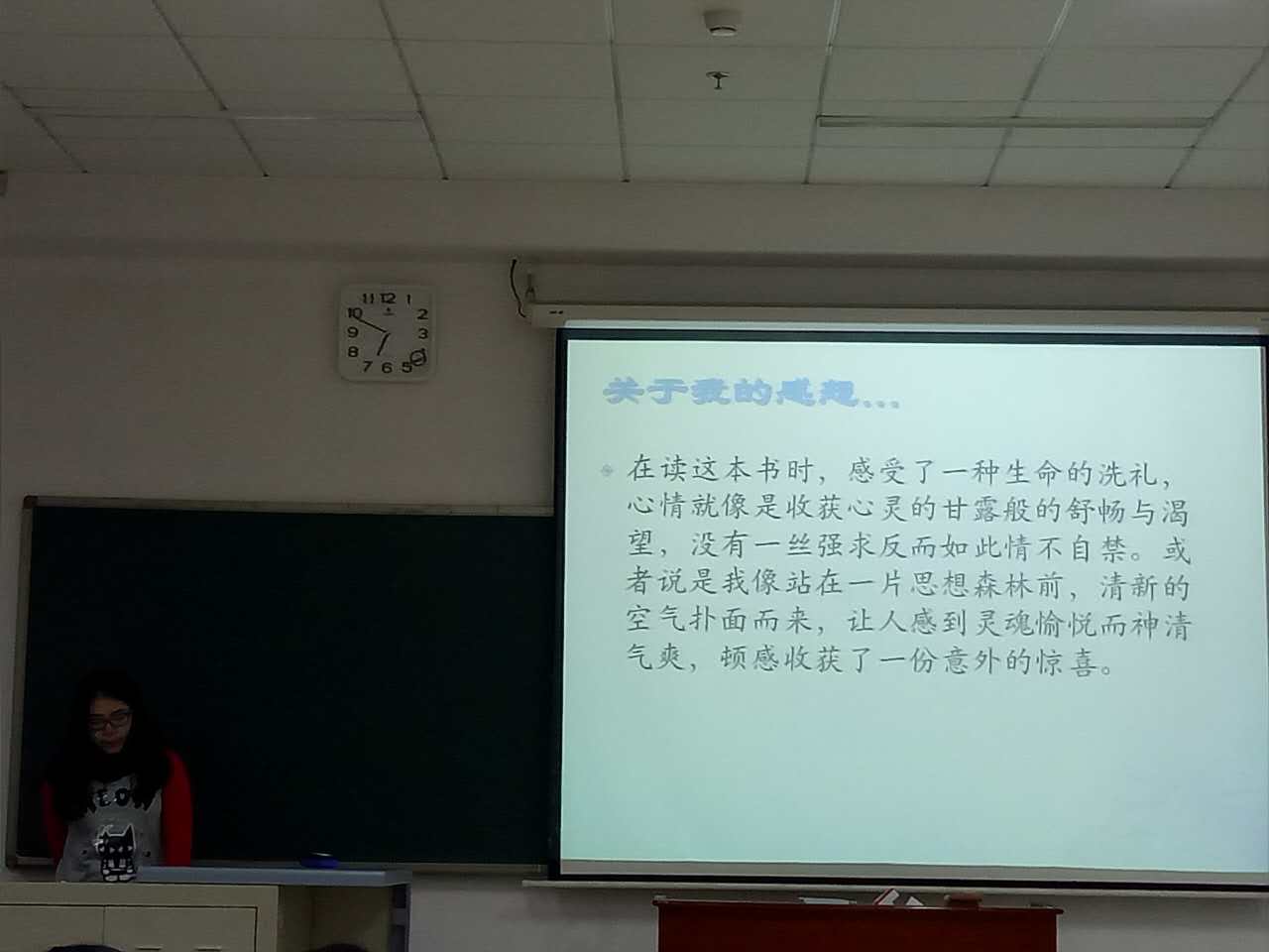 在座的同学们都深深感受到了《子夜》的魅力,提升起了对阅读的无限兴趣。其他班的讲解中不乏分享《了不起的盖茨比》、《苏菲的世界》、《红与黑》、《少年维特之烦恼》、《阿甘正传》以及《七种武器》等这样文学性小说作品的,也有更欣赏《精神明亮的人》一类散文随笔的,也不乏解析《乔布斯传》等名人传记的,更少不了分享《道德情操论》、《全球通史》、《时间简史》、《第三帝国的兴亡》等研究性学术作品的,还有同学则更乐于分享一些如《拖延心理学》、《遇见未知的自己》的更具有实用性、更现代的书籍。“少年维特之烦恼,也许我们都曾有,或许我们都将有。深深地爱着一个永远不可能得到的人而不能自已,这实在是人世间莫大的悲哀,值得我们去同情。”公共管理4班,正在分享《少年维特之烦恼》的文思齐同学如是说。