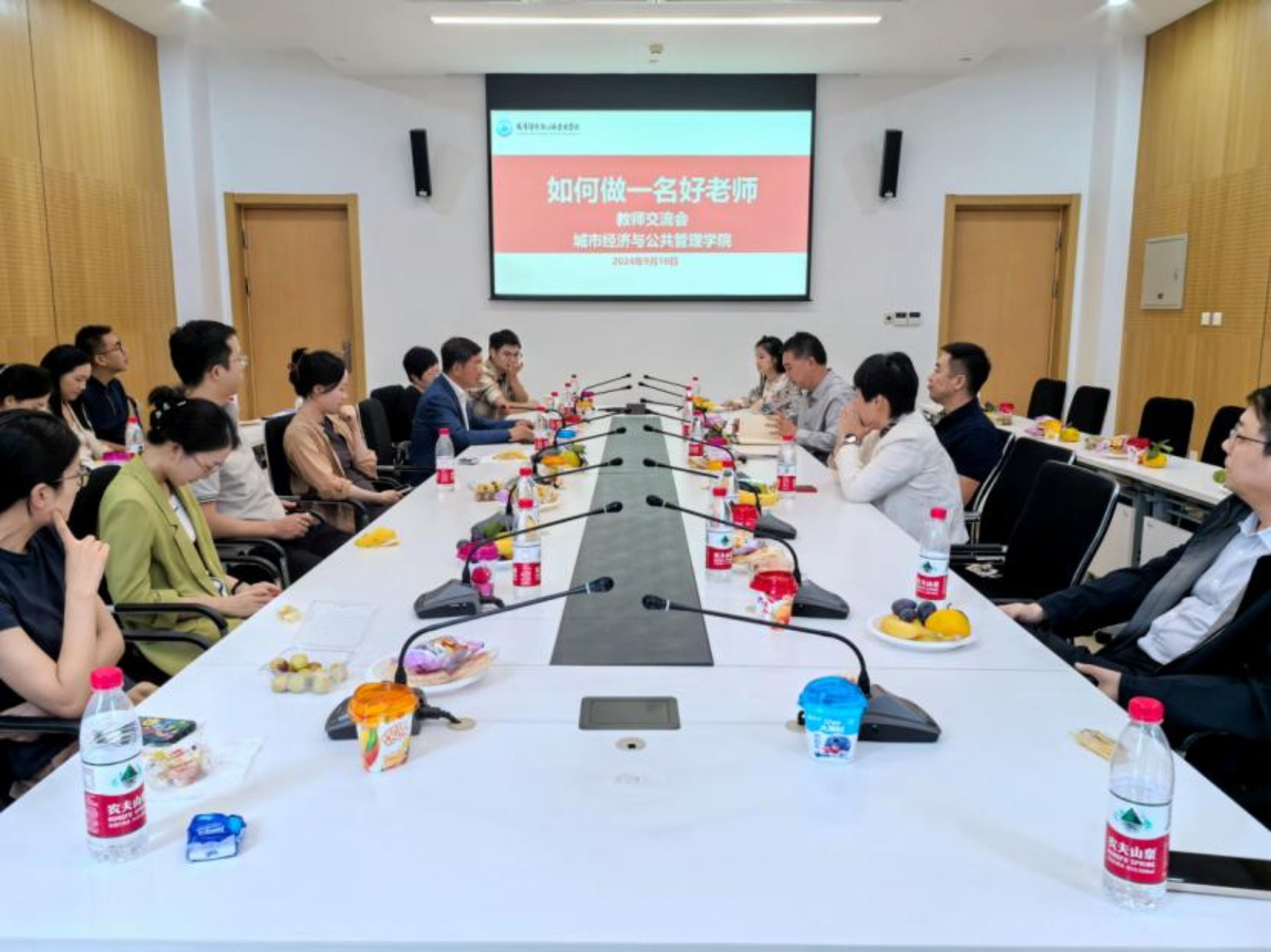 为庆祝第40个教师节,大力弘扬教育家精神,全面落实全国教育大会精神,建设学院高素质师资队伍,9月10日,城市经济与公共管理学院召开庆祝第40个教师节交流座谈会。学院党委书记刘智勇,党委副书记、院长麻宝斌,党委副书记韩静及各系教师代表参加。座谈会由刘智勇主持。