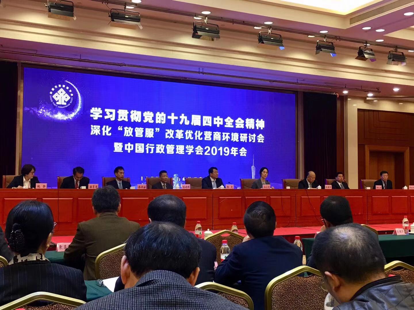 11月29日,“学习贯彻十九届四中全会精神深化‘放管服’改革优化营商环境”研讨会暨中国行政管理学会2019年会在广州市隆重召开。广东省人民政府副省长张虎,中国行政管理学会会长、全国人大常委、全国人大社会建设委员会副主任委员江小涓,中国行政管理学会原荣誉会长、行政管理学奠基人夏书章教授出席会议,来自学术界和实务部门的近三百名专家学者进行了研讨交流。我校城市学院张国山院长带领行政管理系潘娜、王蕾、闫志刚三位教师参加了会议。