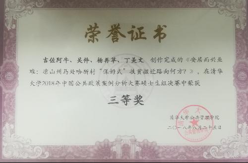 2018-09-13近日,由城市经济与公共管理学院教师团队指导,行政管理专业硕士研究生吴件作为核心成员的“智叟搬迁队”代表队,历时近半年,调研并创作完成的公共政策分析报告,从海内外90所高校的151支硕士生队伍中脱颖而出,取得了清华大学2018年中国公共政策案例分析大赛硕士生组决赛三等奖(总排名第4)的优异成绩。其中,中国科学院大学等高校组队获得一等奖,中国人民大学和四川大学等高校组队获得二等奖。 图1 获奖证书 该团队由首都经济贸易大学、西南大学、四川大学、南开大学各1名硕士生组成,案例分析报...