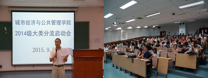 9月23日下午2点,城市经济与公共管理学院在博学楼阶1教室举行了2014级大类专业分流启动会。学院党委书记王德起、副院长张杰、彭文英以及行政管理系、公共事业管理系、土地资源管理系、城市经济管理系和区域经济系等5系教师和158名2014级同学参会。 城市经济与公共管理学院大类专业分流自2011级开始进行,属于学院“厚基础、宽口径”大类教学之后的专业细分。分流首先尊重学生志愿排序,然后考虑学分绩点排序。从前3年的分流结果来看,一志愿满足率平均达到87%左右,满足了大部分同学的专业学习意愿。此次会议旨...