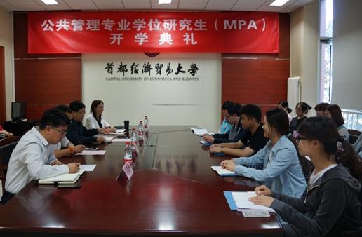 2015-09-169月12日上午9点, 首都经济贸易大学2015级公共管理专业学位研究生(MPA)开学典礼在博纳楼第三会议室举行。城市经济与公共管理学院院长、MPA教育中心主任张国山教授、副院长彭文英教授、张杰副教授,MPA教育中心执行主任刘智勇等领导和老师以及2015级公共管理专业学位研究生参加开学典礼。典礼由刘智勇主持。 典礼仪式在奏唱国歌,介绍出席领导嘉宾之后,彭文英副院长为新学员精彩致辞,希望新生把握好在攻读首经贸公共管理专业学位研究生期间的学习机会,学有所成。随后新生代表王硕同学发言,表达三个“珍...