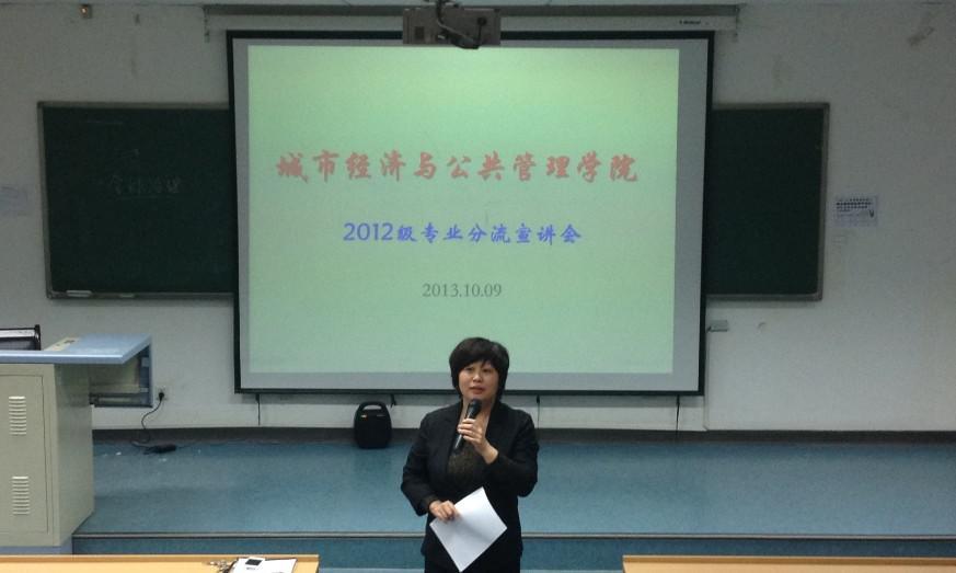 城市经济与公共管理学院2012级大类专业分流正式启动 城市经济与公共管理学院是我校大类分流试点学院。2012年秋2011级182名同学顺利分流,一志愿分流比例达到82.42%。今年秋期,又到2012级同学分流时。 2013年10月9日晚,城市经济与公共管理学院在博学楼阶一教室举行了2012级大类专业分流启动会。学院院长段霞、副院长张杰、书记林卫、党总支副书记宋晓颖、院长助理叶堂林、学院各系主任王蕾、刘业进、彭文英、谭善勇、章浩等老师和2012级同学参加启动会。会议由林卫书记主持。 段霞院长...