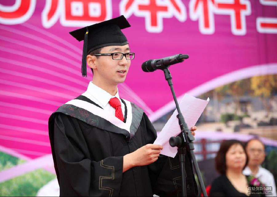 2013-07-10发言如下: 尊敬的各位领导、老师、家长、亲爱的同学们: 上午好! 我是城市经济与公共管理学院2013届本科毕业生徐敬尧,很荣幸能作为毕业生代表站在这里向培育我们四年的母校表达最诚挚的谢意!向辛勤哺育我们的父母、一心教导我们的老师,以及关心和帮助过我们的同学们,致以衷心的感谢与崇高的敬意! 四年前,我们在高考的千军万马中初露锋芒,走入首经贸,那时我们年少轻狂,自以为这个学校难以容下我们自由飞扬的青春和波澜壮阔的理想。于是失望过,后悔过,蹉跎过,当年望着东门“崇德尚能,经世济民”的八字校训,也未能...