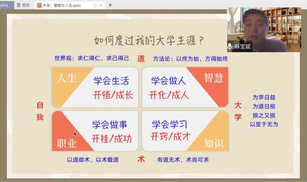 2022年11月2日下午14时,城市经济与公共管理学院线上举办2022级新生学涯成长与公共管理类专业认知讲座,讲座第一讲的主题为“大学·管理·人生”。 本次讲座由学院院长助理徐虹主持,由教育部高等学校公共管理类专业教学指导委员会委员、全国公共管理专业学位研究生教育指导委员会委员、首都经济贸易大学麻宝斌教授主讲,2022级全体新生及新生班主任、班导生共180余人参与本次讲座。 讲座中,麻宝斌教授以“大学”之“大”为题谈“做人”,讲到国家走向繁荣富裕的密码正是“...